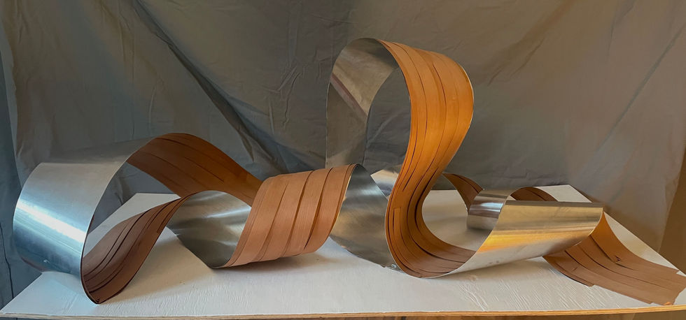 This sculpture is made with sheet metal, laminated wood strips, a wood base, and adhesive. A very fluid composition is created as the sheet metal is twisted very easily making a sturdy base for the laminated wood to be secured on. This sculpture represents the emotion of feeling stuck, feeling like you're going in circles and not progressing how you want to.